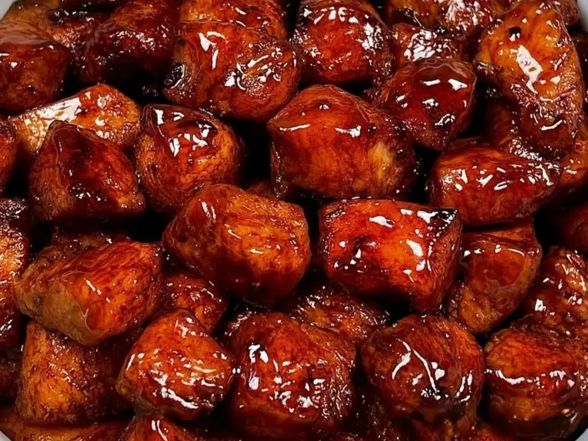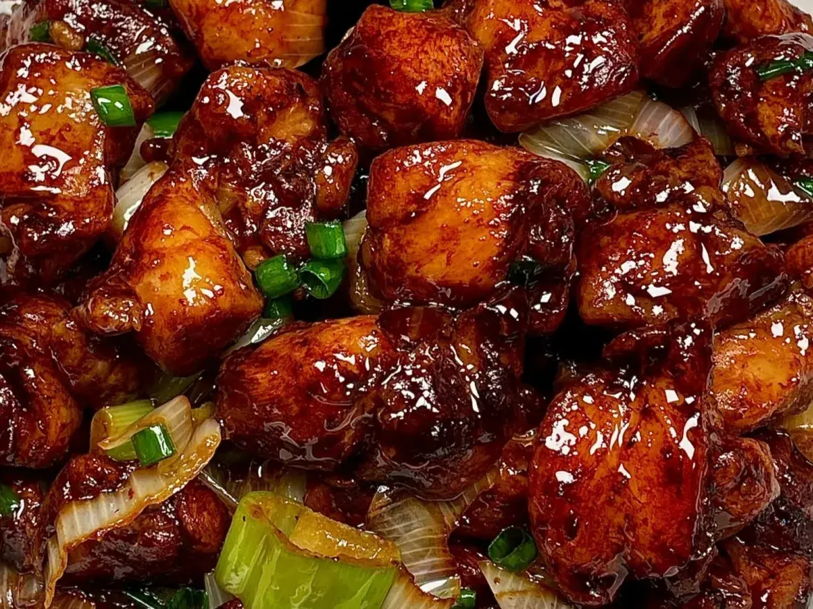 3、热锅烧油,油热以后,放入腌制好的鸡胸肉煸炒油煎,煎至两面金黄后,再倒入调好的酱汁一起翻炒收汁。
