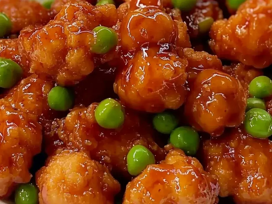 4、另热锅烧油,油热以后,放入酱汁和豌豆一起煮开,接着倒入炸好的樱桃肉一起翻炒收汁,即可出锅开吃。