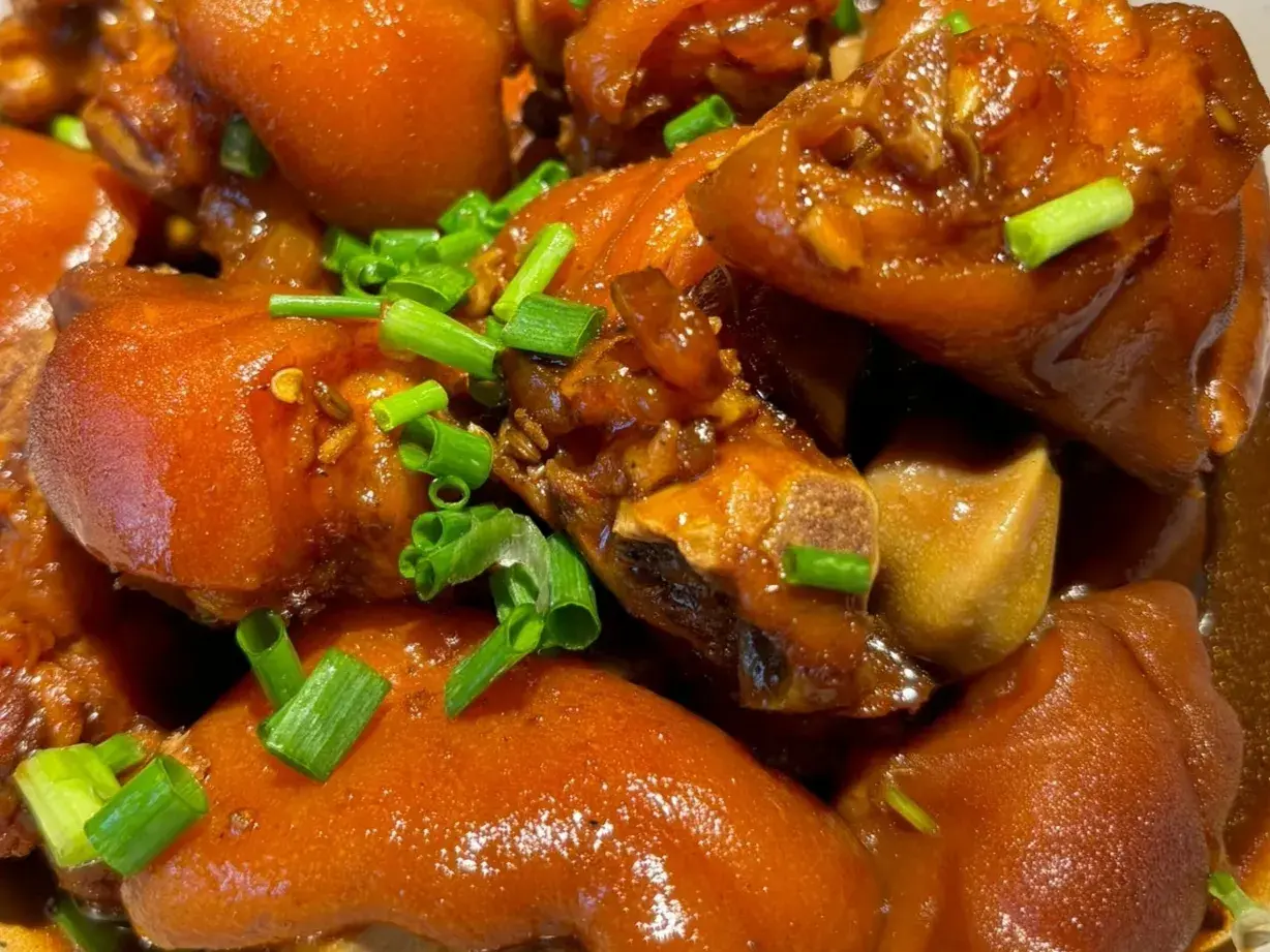 准备食材: 猪蹄、葱姜蒜、桂皮、八角、香叶、葱花。