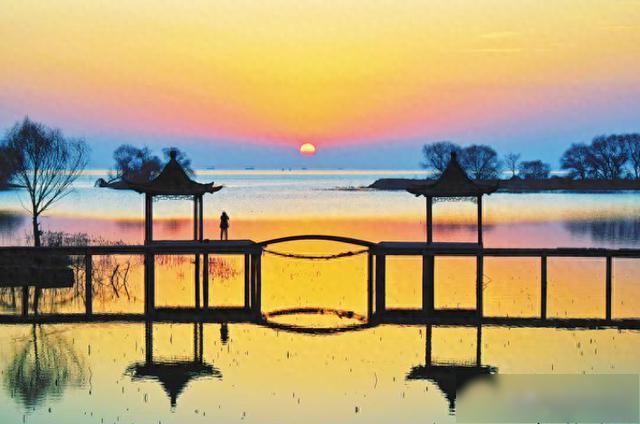 1月15日17时许,巢湖市卧牛山街道下朱村的大寨圩呈现出落日风光。夕阳余晖下,圩中双亭、柳树与水面倒影相互映衬,如诗意画卷。